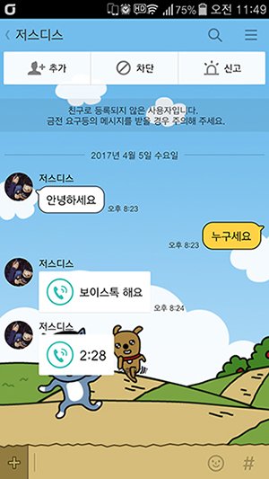 카카오톡으로 저한테 말 걸어서 모르는 사람이라서 누구세요 했더니 바로 보이스톡으로 전화가 왔었는데, 그 사람 카톡 친추해서 들어가 보니 여자사진 올려놓고 여자인척 행세를 하고 있네요.
