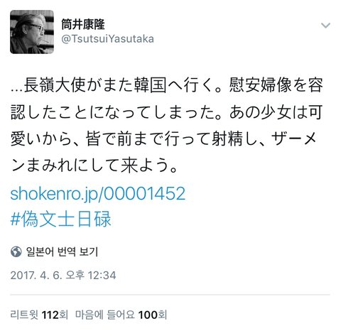 시달소 원작 작가인 츠츠이 야스타카의 오늘자 트윗 모두 위안부 소녀 동상 앞에 가서 다 같이 사정해서 소녀를 정액 범벅으로 만들자는 내용이래 더럽다 진짜