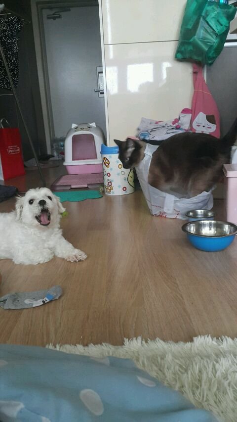 고양이랑 같이 자란 강아지는 식빵을 꿉습니다...