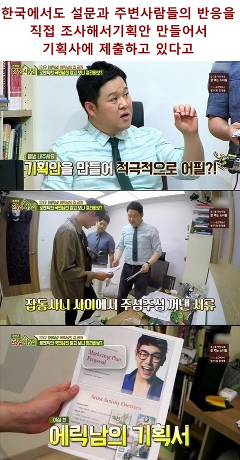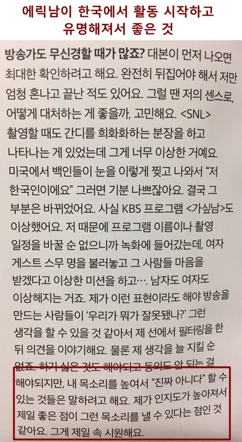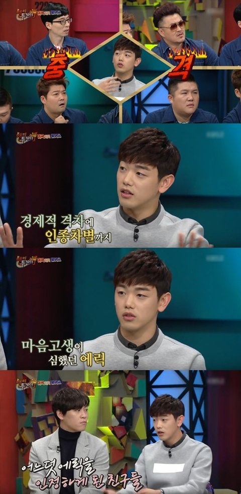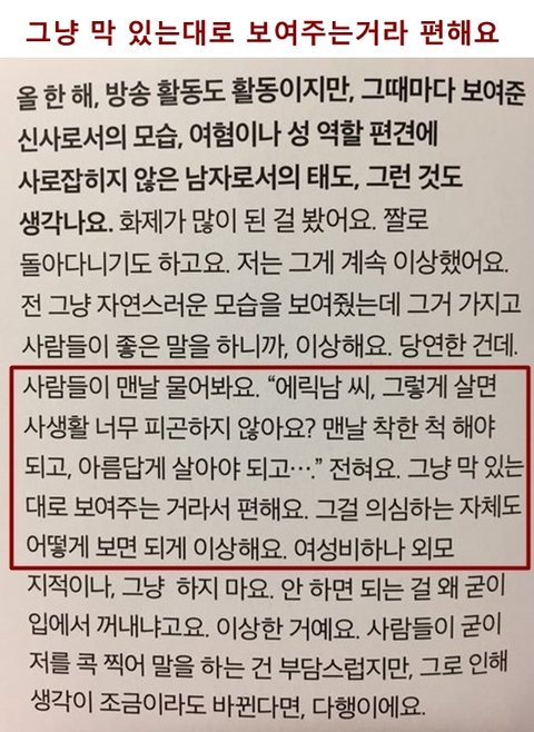 진짜 사람이 머라해야하지?? 아무런 오염이 안돼있다!!!ㅜㅠㅠ 지난번에 듀가에 남자로 오해받는다는 파트너랑 같이 노래부르는데 보통 티비에서 위로해주는거 보면 미인이라서 여성스럽게 꾸미면 예쁠거라느니 화장 조금만 바꿔도 다른사람같을거라느니 할때 정말 공감안갔는데.. 에릭남이 한 소리는 너무 간결하면서도 와닿는 "멋있고 그게 맞는것 같다"였는데.. 정말 그 사람 자체를 존중해주는 순수한 사람만이 할 수 있는 대답!!!ㅠㅠㅠ 노래도 엄청 잘부르고 뭐하나 빠지는게 없는듯 ㅠㅠㅠ