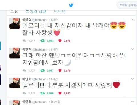 좀 오글거리지만 이번일 통해서 확실히 느낀게 내 첫 가수가 비투비여서 너무 고맙고 내 첫 팬덤이 멜로디여서 너무 감사하단 거야. 정말 우리는 앞으로도 보여줄것이 무궁무진하게 많으니까 이번 년도도 더 기대되기도 하고. 마무리는 어떻게 끝내야 할지 모르겠는데 비투비 멜로디 앞으로도 더 잘 해보자!