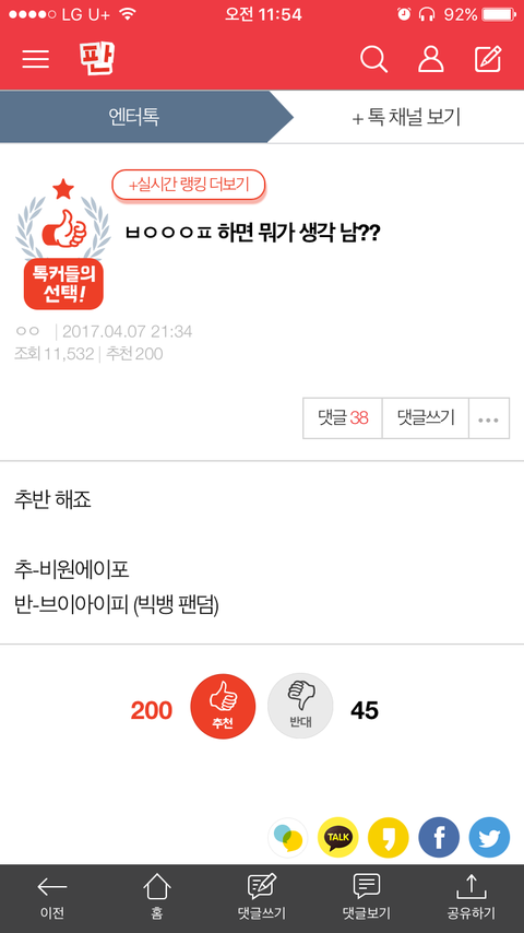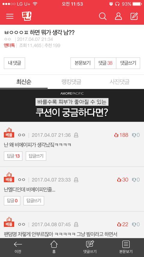 나만그런게아녔음ㅋㅌㅌㅋㅋ 저 댓글 추천수 보듯이 거의 이백명이 저래 생각하고있고 심지어 그냥 일반 다른댓글도 비에이피 아니야? 이러면서 들어왓뎈ㅋㅋㅋㅋㅋㅋㅋㅋㅋ 아개읏곀ㅋㅋㅋ 나만웃긴가모르겠지만 이렇게 비에이피 언급되는거는 또 웃기넼ㅋㅋㅋ