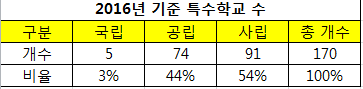 - 세부적으로 말하자면 특수학교 170개 중 29개가 서울, 경기도에 34개가 몰려있어.