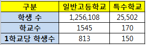 - 아래 표를 보면 일반 고등학교에 평균 1학교당 813명이 다니는데 반해