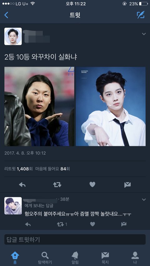 장문복 실력 없다고 까면서 기본기도 있는지 없는지 모르는 라이관린 빠는거야? 나는 둘 다 좋지만 저건 너무 이중잣대 아니냐ㅋㅋ 그나저나 라이관린 이완 닮음.. 넘나 잘생.. 문복이 상처 받지마 ㅠㅠ 남잘되는 꼬라지 절대 못보는 년들..