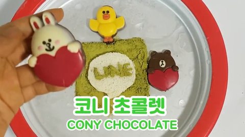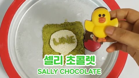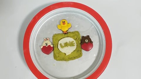 Line 모양 틀을 그 위에 올려 녹차가루를 솔솔 뿌려주면 글자가 남아요 ㅎ