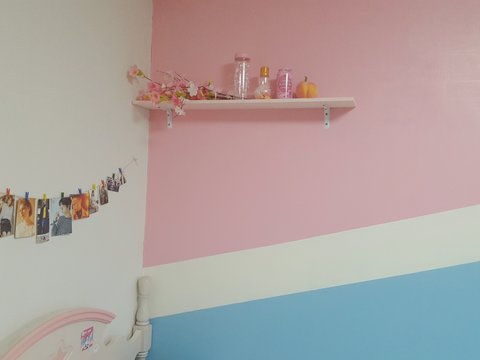 페인트가격은 만원이하로 기억행 도구들도 합쳐서 만원 안으로 다 살 수 있을꺼야! 선반은 이마트에서 산거고 선반도 흰색이랑 분홍색 섞어서 페인트칠 한번 해준거야! 지금 학교라 나머지는 집가서 추가할껭