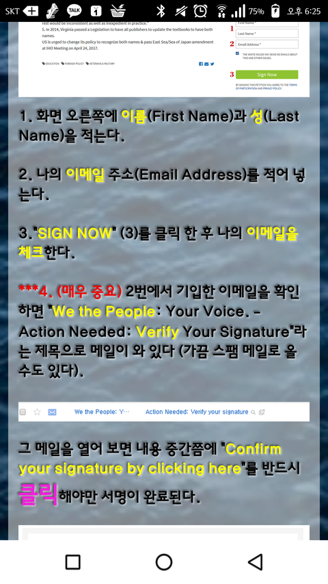 사이트에 들어간 뒤 성과 이름, 이메일 주소를 입력하고 Sign Now를 클릭합니다. 그 후 입력한 이메일의 We the people: Your Voice.- Action needed: Verify your signature이라는 제목의 메일을 클릭하여 메일 중반쯤의 Confirm your signature by clicking here을 클릭해야만이 서명이 완료됩니다.