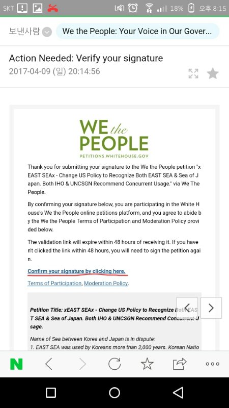 구래서 지금! 동해라는 우리의 이름을 되찾기 위해서! 미국 백악관에 청원을 넣기위해 서명운동을 하고있어 근데 청원을 넣기 위해선 10만명의 서명이 필요하대 아직까진 1000명밖에 안했어 ㅜㅜ