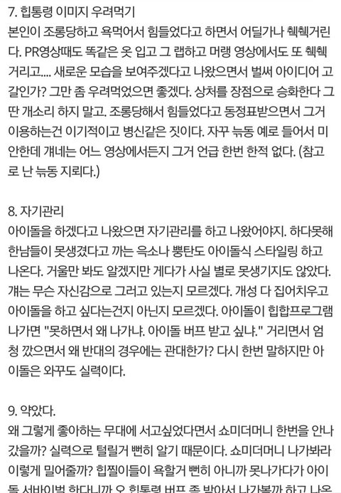 ㅂㅂㅂㄱ ㄹㅇㅍㅌ 힙통령때문에 맘고생하고 힘들었고 이제 랩으로 다시 인정받고 싶다면서 쇼미더머니 아닌 프듀나오고 계속 상처받았다는 힙통령으로 계속 우려먹음