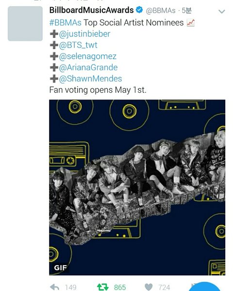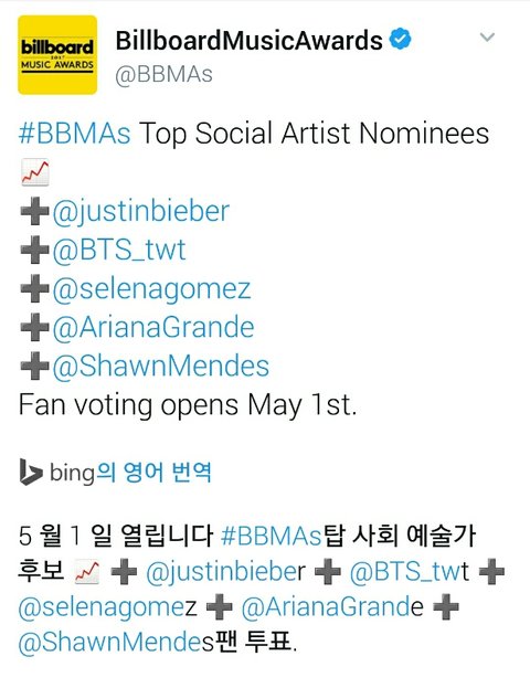 + 후보는 더 있어 일단 방탄이 오른거만 가져와 봤어! 자세한 후보 볼려면 빌보드뮤직어워드 공식계정 들어가면돼