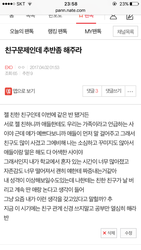 아직까지 얘한테 대놓고 말은 못했는데 아직까지 소외 당하고 있긴해 근데 얘가 작년에 나랑 다른 반일때 반배정이 좀 이상해서 내가 쉬는시간마다 가주고 밥도 같이 먹었어 나는 친하니까 이게 당연하다고 생각해서 작년 우리 반 애들보다는 얘랑 더 많이 놀았는데