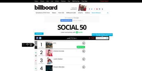 social 50 chart를 통해 social media플랫폼에 가장 영향을 많이 끼친 아티스트가 누군지 음악쪽 데이터 분석하는 회사에서 아티스트를 rank한다고 해 ㅎㅎ