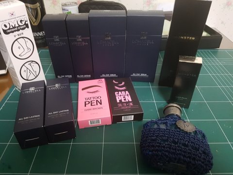 약 20마넌치삿네요 .. 로하셀 스킨토너+세럼+세럼비비 앙스샵 털없찡 냄새 개극혐 블랙몬스터 립밤,다운펌 유리카 타투펜 등등..