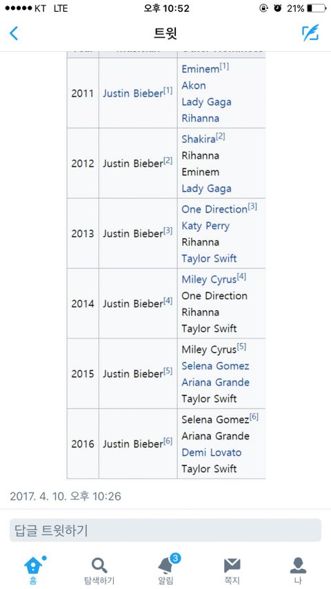 이 상은 어린 팬들의 ㅋㅋㅋㅋ 헌심적인 스트리밍이랑 검색으로 인해 올른걸로 보이는데 솔찍히진짜 웃긴게 브이앱 팔로워니 앨범판매량 이딴걸로 원탑 정하려고 하는데 그렇게 따지면 AKB48이나 루한이 빅뱅보다 아시아에서 더 인기 높은거임? 그리고 빠순이들 좀 그만했으면 ㅋㅋ 지들이 ㅈㄴ 스트리밍하고 해서 올른거지 무슨 누가보면 방탄이 미국에서 유멍가수인줄 ㅋㅋㅋ 그러고 갓세븐은 Billboard Heatseekers Album에서 3위, World Album에서 1위 하고 World Digital Song Sales에서 3위했던데... 음.악.으.로.. 더 놀라운데 아무말도 않함? 아미들 대.단.하.다.는걸 또 느끼고 가네 ㅋㅋㅋㅋㅋㅋㅋㅋㅋㅋ