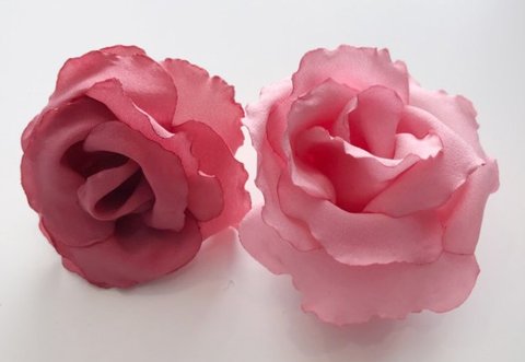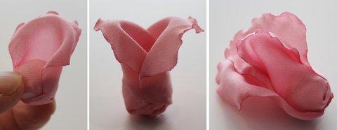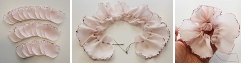 연핑크색 폴리에스테르 원단을 꽃잎모양으로 재단하고