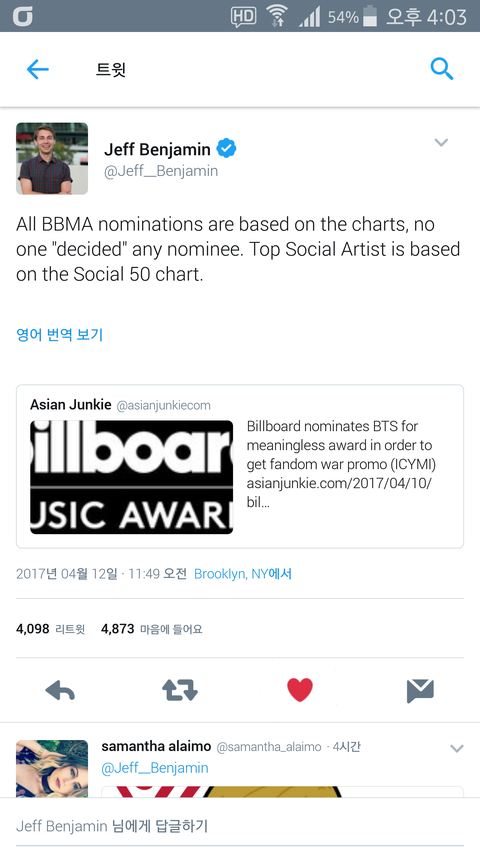 "모든 BBMA(빌보드 뮤직어워드)의 후보는 누군가가 후보를 선정하는것이 아닌 차트에 기반한것이다.Top social chart도 Social 50 Chart에 따른다"