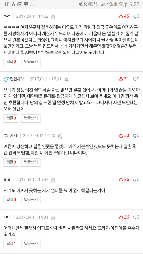 여자친구는 밤낮으로 이렇게 어머니가 쪼아대다가 중간에 어디로 도망갈거 같다면서