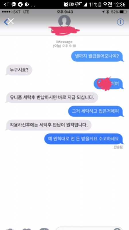 앤써에서 퍼온거긴한데 정확히 뭐냐면 옷은 세탁하고 돌려줘야한데 세탁하고 옷을입고 돌려줬는데 그 돌려준 옷을 받고 옷입고 세탁안해서 알바비못줌 이내용임 사장 ㅂㅅ