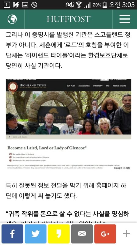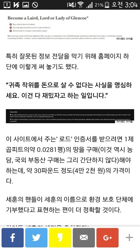 기사 본문에서 알수 있듯이 스코틀랜드 정부에서 하사한 작위가 아니고 '하이랜드 타이틀' 이라는 환경단체에서 30파운드 (한국돈 4만 2천원)에 해당하는 땅을 사면 일종의 기념패처럼 증정하는 거.