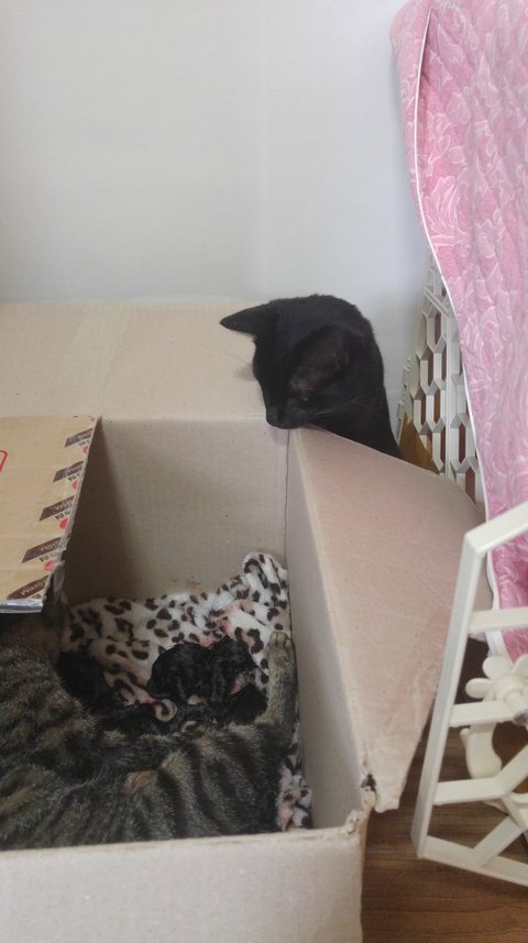 출산다하고나서 제가 캣타워 옆 박스로 새끼들 옮겼더니 콩이가따라와서 저러고 있었구 땅이는 신기한지 어쩔줄몰라하면서 쳐다만보더군요