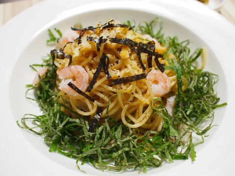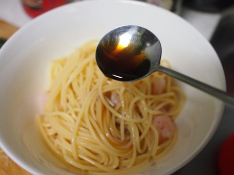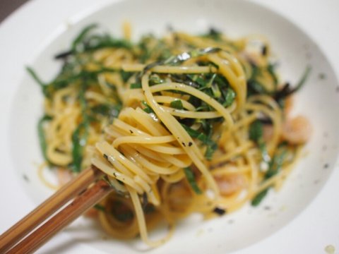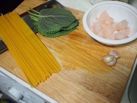 재료는 스파게티면(엔젤헤어 다먹은거 깜빡함 ㅠ), 깻잎, 새우, 마늘, 쯔유, 들기름, 후추