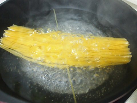 끓는물에 소금 풀고 면을 삶습니다.