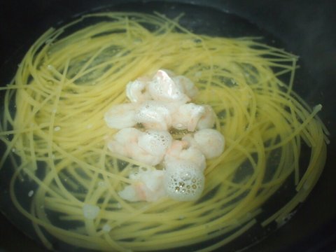 4분정도 지났을때 얼어있던 새우를 넣고 같이 삶아줍니다.
