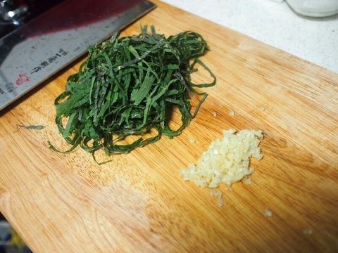 그 사이 깻잎은 썰어주고, 마늘은 잘게 다져줍니다.