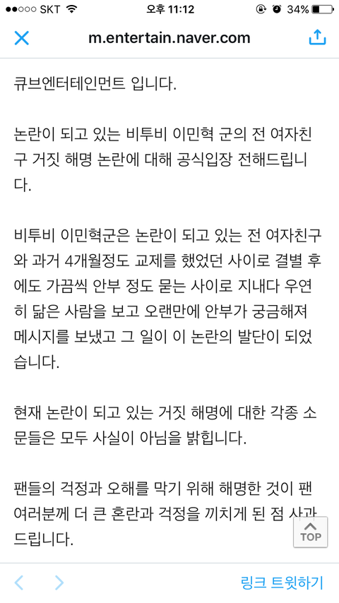 ㅊㅇㅅ과 전여친이 없는 얘기까지 지어내서 민혁 인별에 댓글 남긴거고 그것 때문에 솔직하게 피드백을 올렸던 민혁은 오해로 기사+악플+실검에 오르는 등 많은 피해를 입음.현재 소속사인 큐브에서 공식 피드백이 올라온 상태이며 팬들은 야구선수 최씨에게 사과 요구 중, pdf 따는 중. 고로 결론은 최씨 사과해