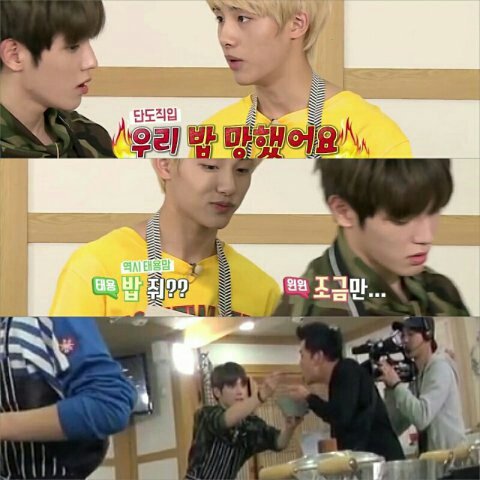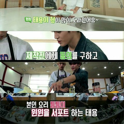 3. 또 다른 한식 요리 대결에서 윈윈과 재현 한 팀. 비빔밥이 주제이지만 재현 윈윈 팀 밥에 물을 잘 못 맞춰서 밥이 망해버린 상황. 밥을 구하러 윈윈이 태용에게 직행해서 밥이 망했다고 하자 생각할 틈도 없이 바로 밥 줄까라고 물어본 후 본인이 지은 밥 나눠줌.