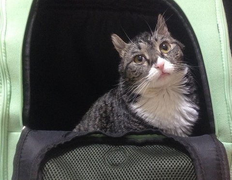 가방에 들어간 나나. 나나는 여전히 나흘에 한 번 주사를 맞으러 병원에 갑니다. 따뜻한 날씨 덕분에 병원 가는 길이 즐거워졌어요.