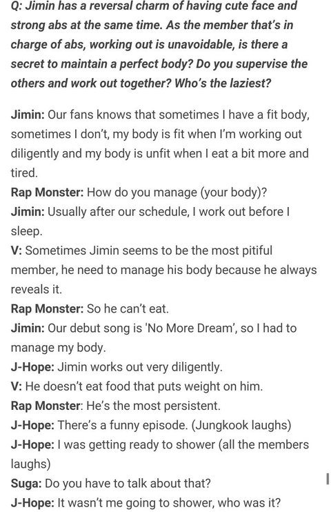 지민 : 팬들은 내가 몸이 좋을땐좋고 아닐땐 아니란걸 안다. 열심히 운동하면 좋고 좀 많이