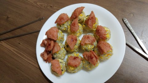 냉장고에 먹을게없어서 있는재료로만 만들어본 주먹밥이예요 머리가 허전해서 스팸볶아서 머리에 얹어줬어요ㅎㅎ