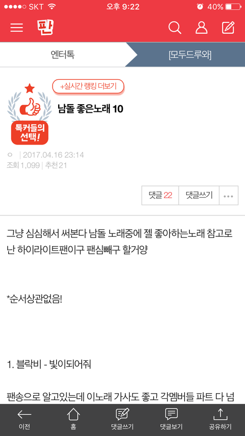 그냥 심심해서 써본다 남돌 노래중에 젤 좋아하는노래 참고로 난 하이라이트팬이구 팬심빼구 할거양
