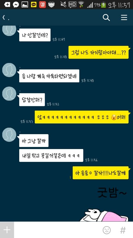 쟤가 자지말고 지랑 카톡하자했으면서 바로 잔다고말해서 ㄹㅇ김빠진?.. 실망..?했음 ㅜㅜㅜㅜ 계속 카톡하고싶었는데......ㅜㅜㅠㅠㅜㅜㅜㅜ