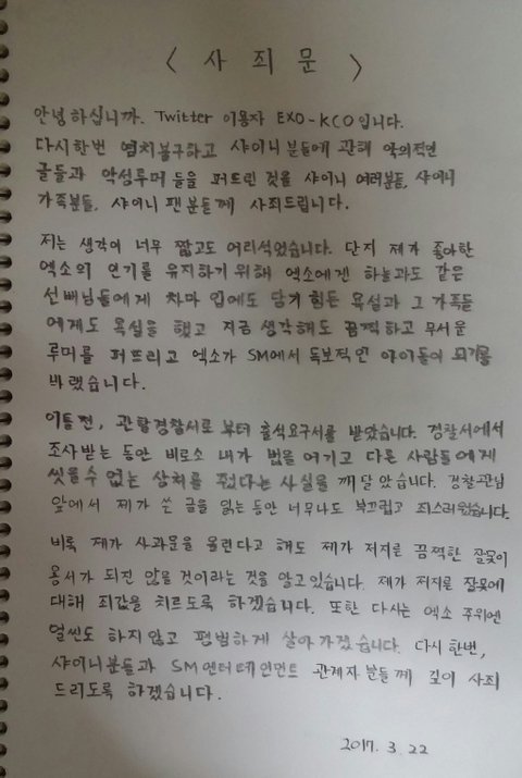 엑소엘이 선배 아이돌한테 악성 루머 퍼뜨리다가 고소 당하고 사죄문씀