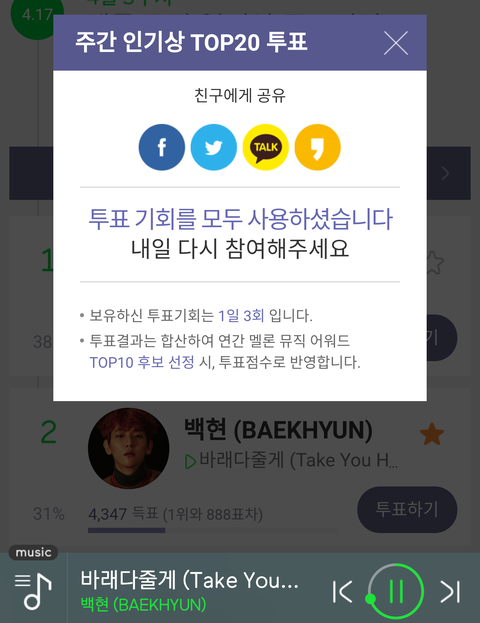 백현, ‘바래다줄게’로 中 음악차트 1위