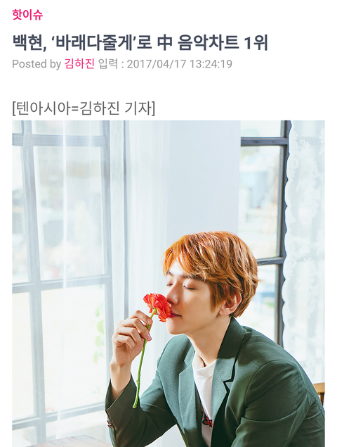 백현, ‘바래다줄게’로 中 음악차트 1위