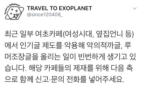 웅녀들! 짹에서 퍼온건데 본문에 있는 악의적까글, 루머조장글 쓰는 애들이 네이트판에서 난리치는 어그로들과 같은 사람인것 같아서ㅠㅠㅠㅠ 웅녀들도 시간되면 한번씩 본문에 있는 글대로 신고나 문의전화하는거 같이 도와준다면 정말 고마울것같아ㅠㅠㅠㅠ