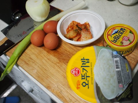 재료는 밥, 참치, 계란, 김치, 양파, 파, 마늘, 기타양념.