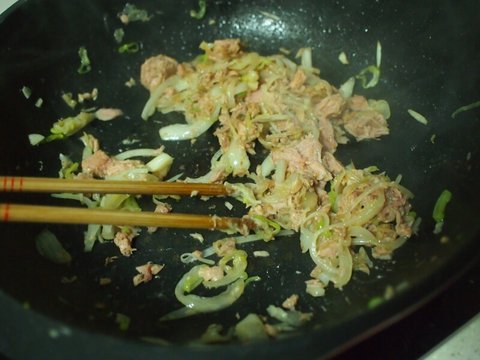 양파가 어느정도 익으면 참치를 넣고 볶아줍니다.
