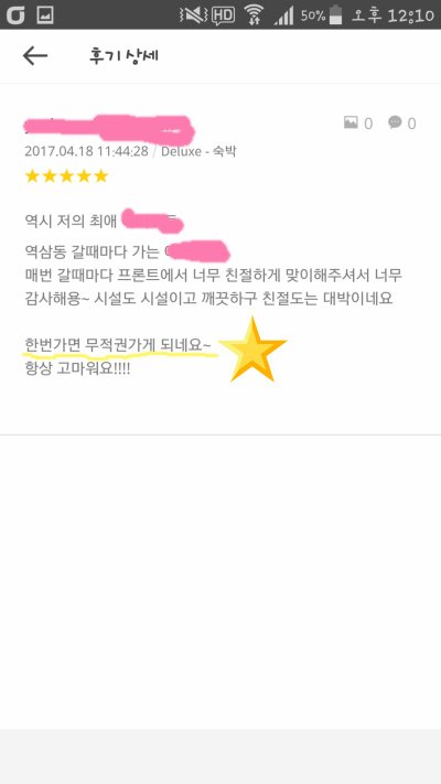숙박이용인증 받고 올린 정당한 후기인데 왜 삭제하죠?