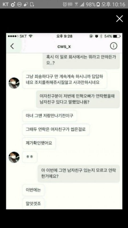 아니 이민혁이랑 여친은 최우석이랑 여친이 사귀기전부터 자주는 아니더라도 연락은 해왔던 사이고, 여친이 남친(=최우석) 생기면서 연락을 안할려고 그랬던거 같은데 어느날 우연히 은행에 가서 성이랑 얼굴이 비슷한 사람을 봄, 그래서 혹시 가족일까 라는마음에 카톡하려다가 전화번호가 없음. 그래서 인스타 다이렉트로 나 왜 니 전번없냐 이렇게 보냄 근데 그때 최우석이 여친폰으로 게임하는중이였음 그랴서 물어봤겠지 그리고 그동안 했던 메시지 여친이 다 보여준거같음 그래서 최우석은 이민혁 인스타로 달려가서 다짜고짜 쌍욕을 해댔고 다이렉트로 보냄 쫄은 이민혁은 팬카페에 사과문을 올리고, 큐브에서도 피드백을 함 근데 큐브의 피드백과 최우석커플의 증언은 정반대로 엇갈림 결론:현재로서는 사겼는지 안사겼는지 모른다는거아니냐?