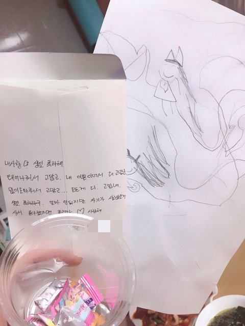 엄마 생일 축하한다며 고사리같은손으로 그린 그림과 아끼는 비타민을 나눠주는 딸과