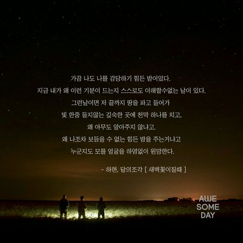 "해가 뜨기 전 새벽이 가장 어두우니까 먼 훗날에 넌 지금의 널 절대로 잊지 마 지금 니가 어디 서 있든 잠시 쉬어가는 것일 뿐 포기하지 마 알잖아 "