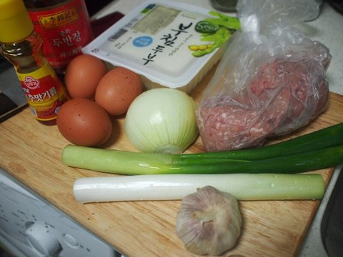 재료는 두부, 파, 계란, 양파, 마늘, 돼지고기, 두반장, 고추기름.