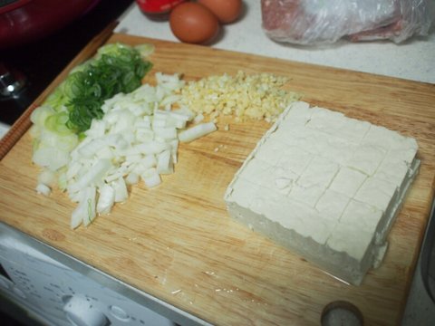 두부는 모나게 썰고, 양파와 파 는 챱으로, 마늘은 다져줍니다.