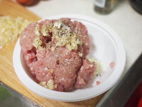 돼지고기는 다진마늘 조금, 소금, 후추, 소주 조금 넣고 밑간해주고 기다립니다.