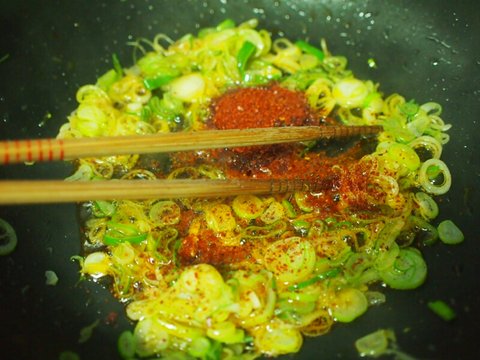식용유 2, 고추기름2, 에 파 넣고 볶다가 고추가루를 조금 더 넣고